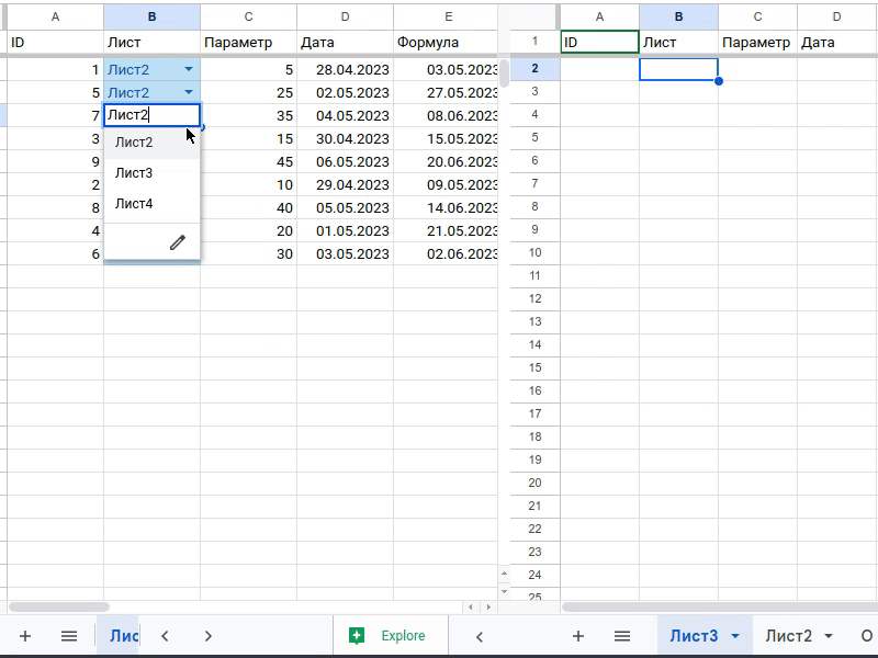 Добавьте еще одну колонку с выпадающим списком, содержащим имена листов, которые были перечислены выше