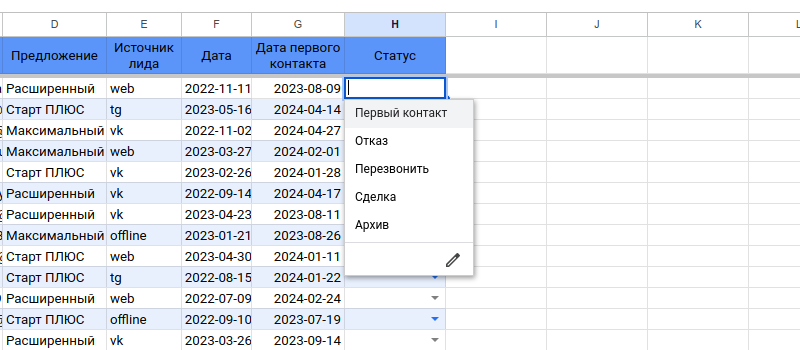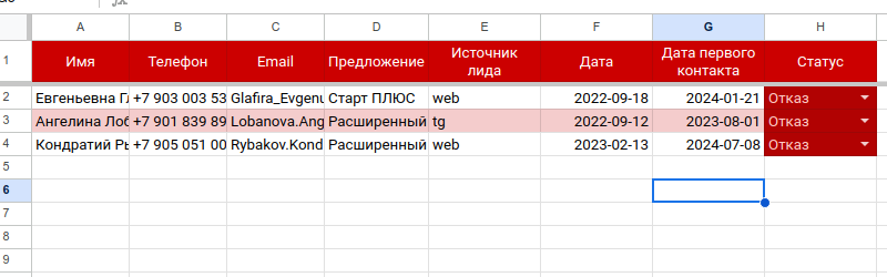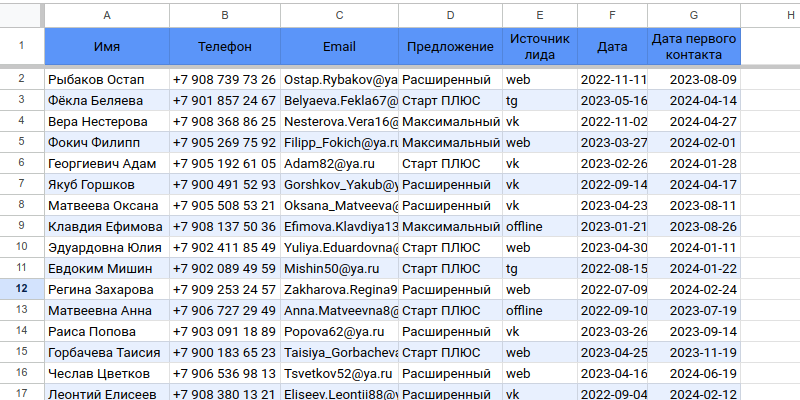 На листе “Первый контакт” внесите данные, которые вы будете хранить. Например:
